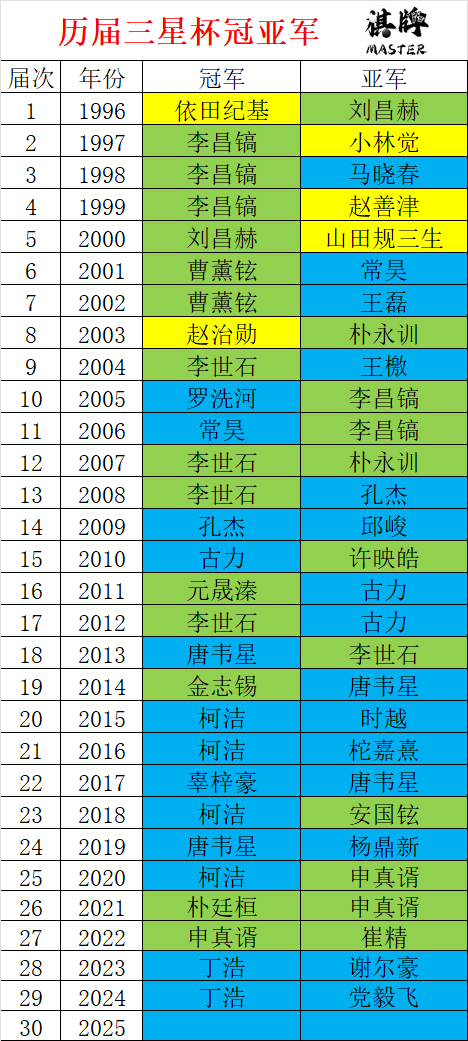 第 30 届三星杯世界围棋大赛本赛共有 32 名棋手参赛,因此这场11月即将决出的三星杯冠军,三次中韩决战,巧合的是,同时这也是2025年产生的最后一个围棋个人世界冠军,谢科、如果此次中国能够夺冠的话,